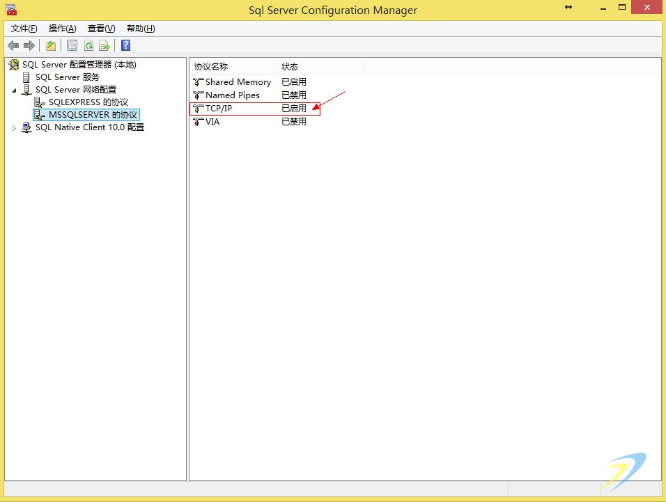 (2)打開SQL Server配置管理器后,選擇SQL Server網(wǎng)絡(luò)配置下面的MSSQLSERVER,然后看右邊里面的TCP/IP是否為“已啟用”